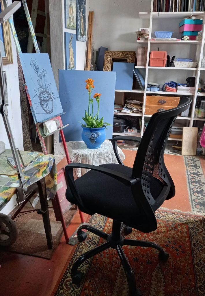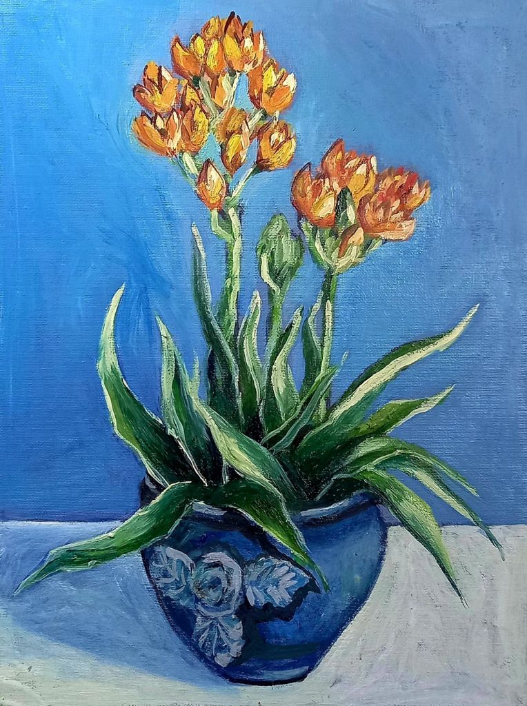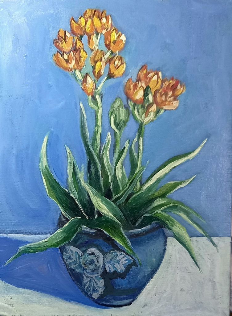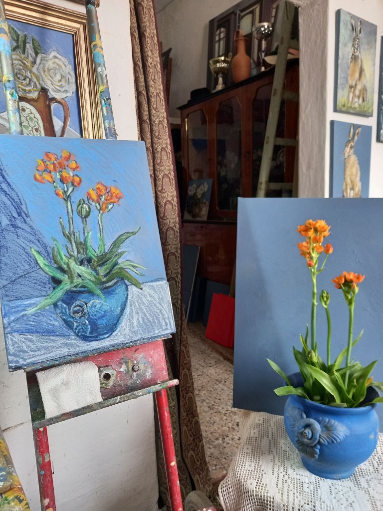 It was fun painting the flower. All my recent still lives are done from life. I set this up on a chair as the gas heater is not available. .