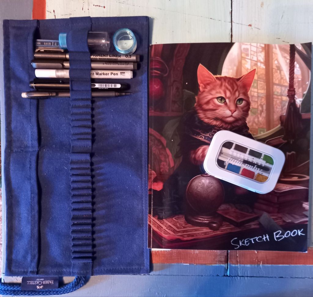 I’m liking my cat sketchbook. I experimented with acrylic pens today. Not good…..went through three pages. I’ve put a few sheets of watercolour paper at the back.