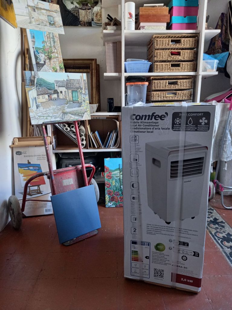 Just after lunch I got a very off and on phone call from the Amazon courier. As in I missed large parts of the conversation . But I understood that I would meet him in the piazza la salsa in half an hour. He would be delivering a portable air conditioner.