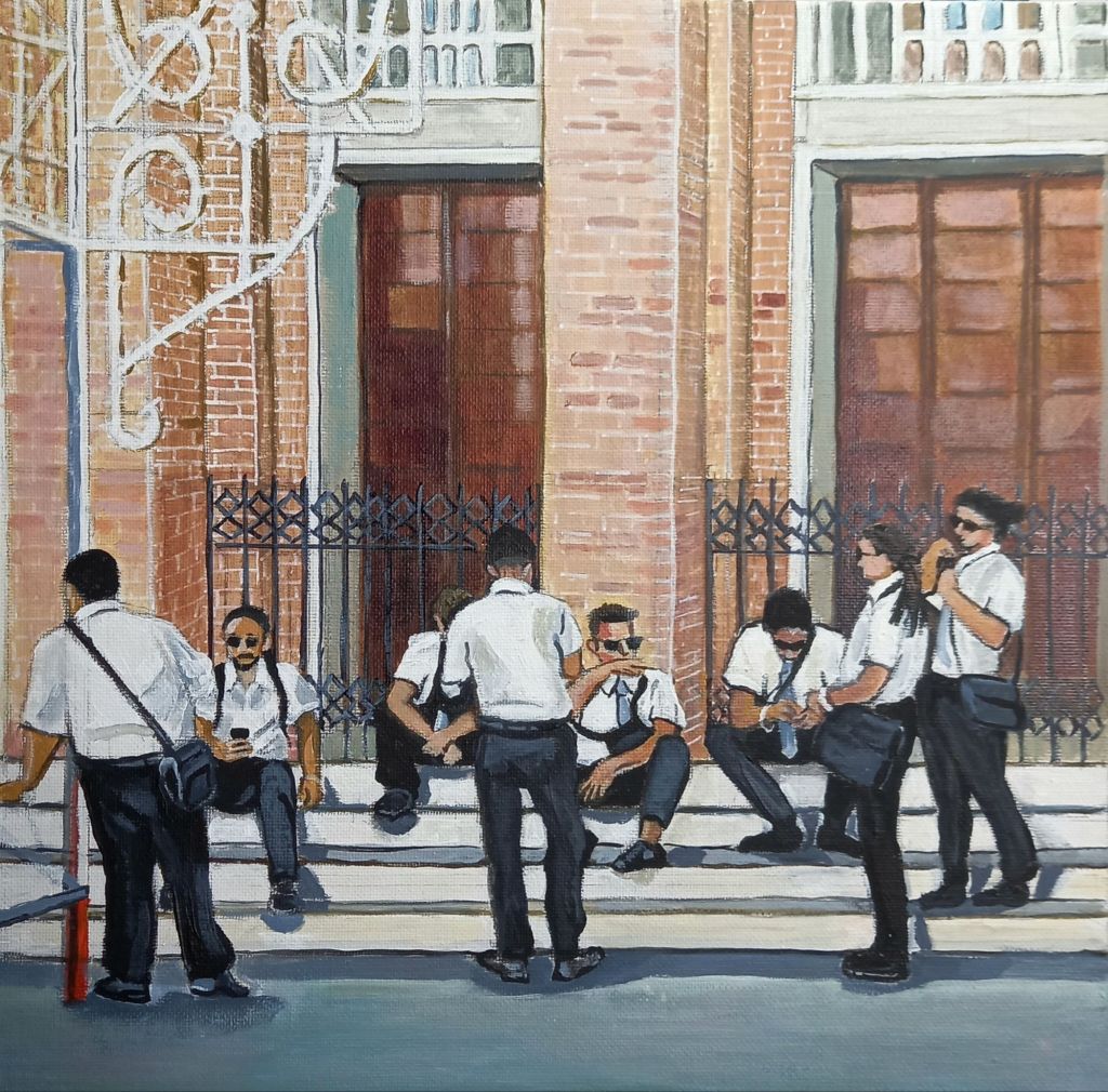 Having been bothered with the composition of the previous painting I bravely added a lady in a yellow dress to it……and then painted over her. At least I tried.