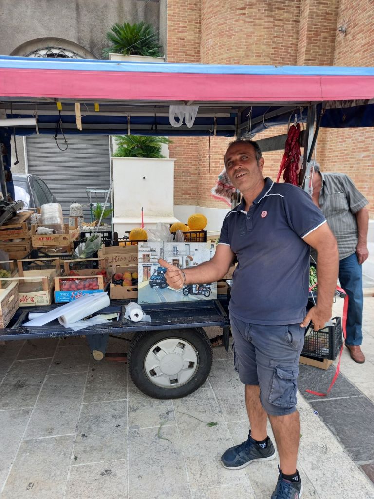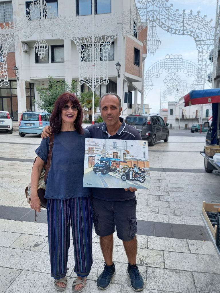 On the way across the piazza the fruit seller called to me. He’d seen the painting which he was in and would like a photo of us with it. Why not?
