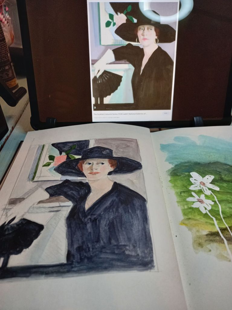 As I’m supposed to be practicing in my sketch book to get me in the mood and to experiment , I found a photo of a painting of a lady in a black hat and copied it. I’ve always liked this painting. I used watercolours. Which I’m not very experienced with.