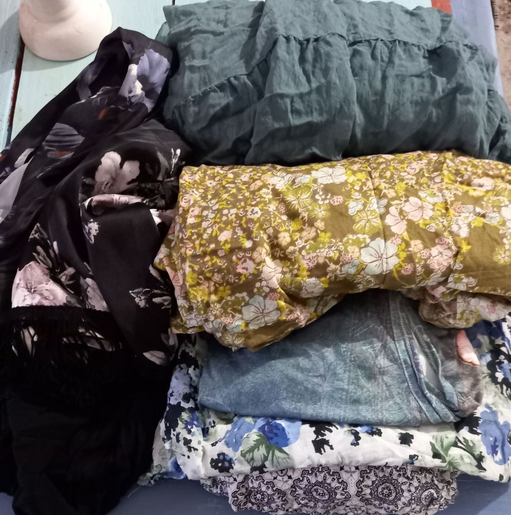 Then I decided that sleeveless tops are not flattering any more. I wondered if I could make sleeves and attach them…..so I found the bags of clothes I mean to throw out when I can and found some suitable material as well as a couple of tops with long sleeves which I could cut off.