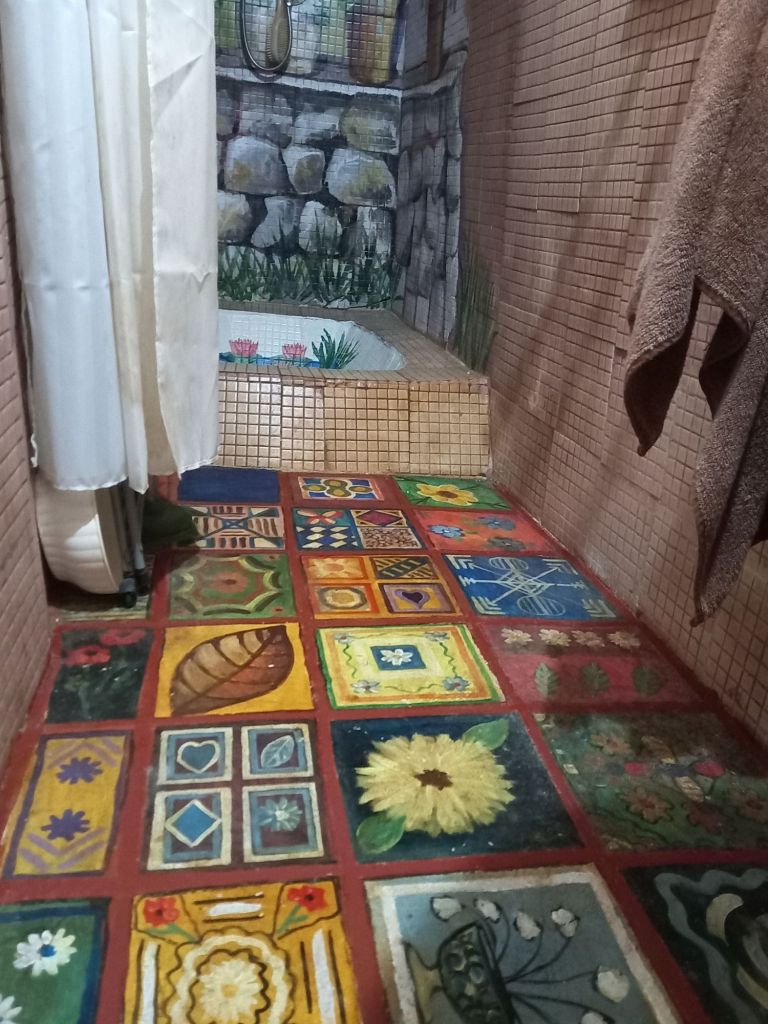 And then I thought that maybe I could tidy up the shower room floor by repainting the terracotta lines between the tiles. I bought a new polycolour vinyl paint to use for roof tiles, but it looked exactly right for the floor.