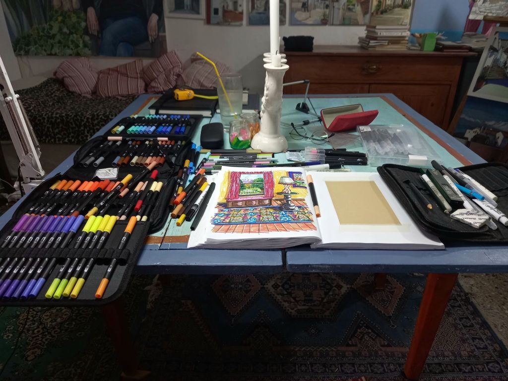 So I now have a large sketchbook with very thick paper, more brush pens , more acrylic paint and a tin of satin varnish.