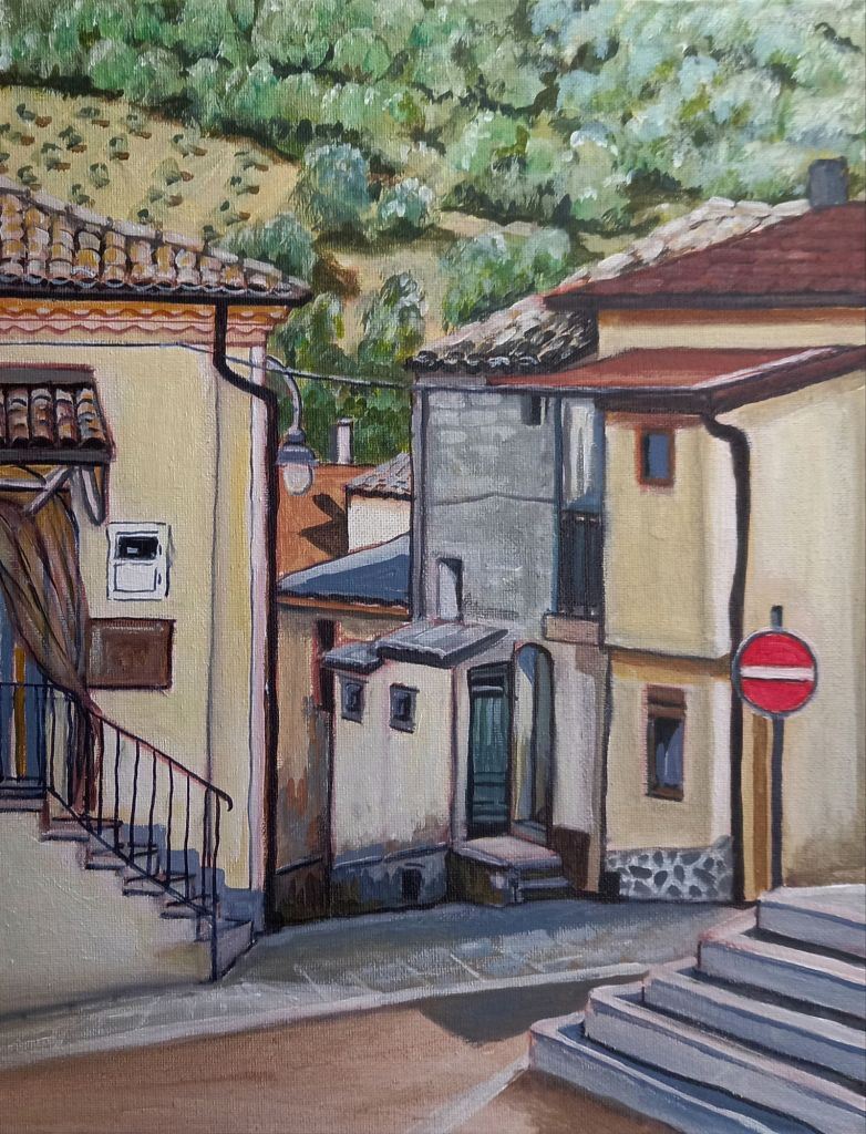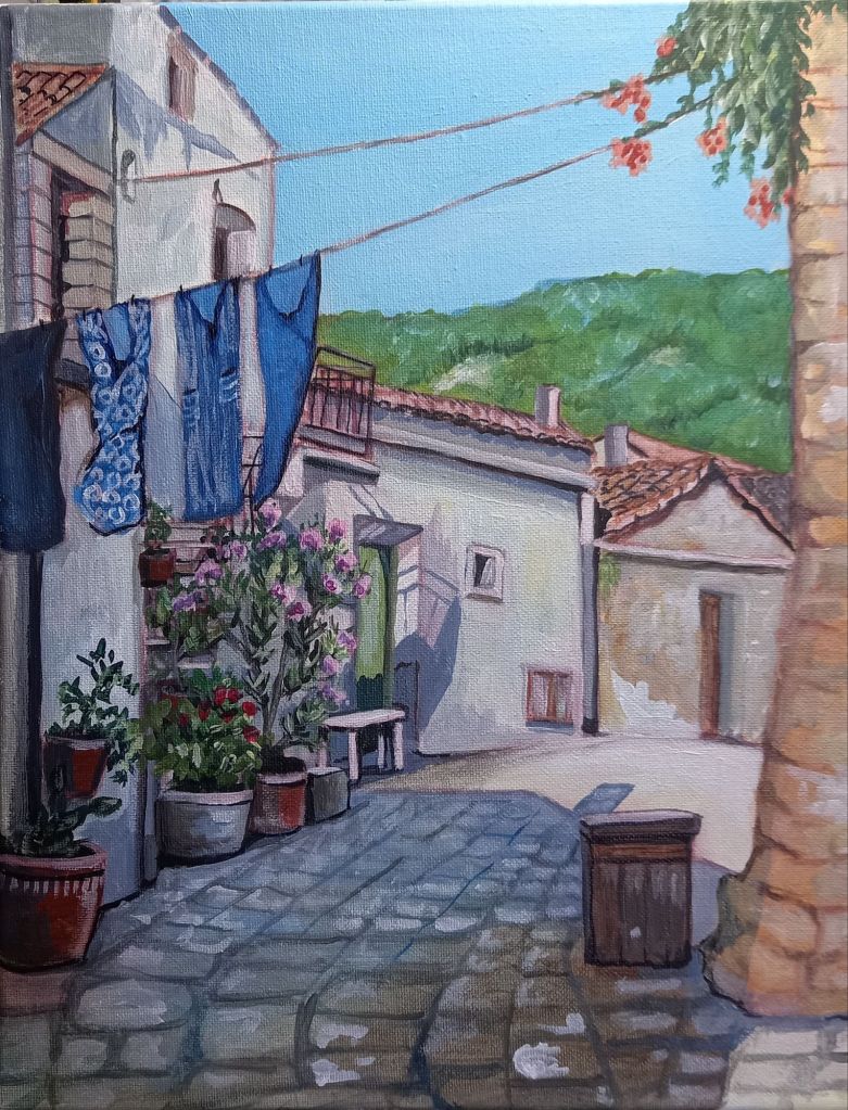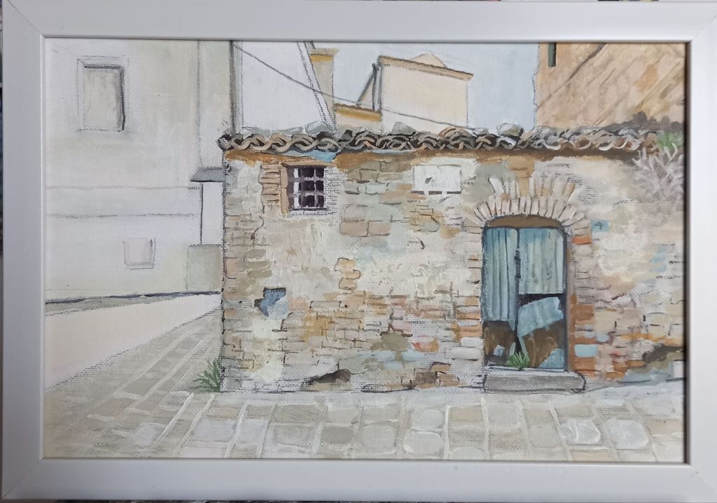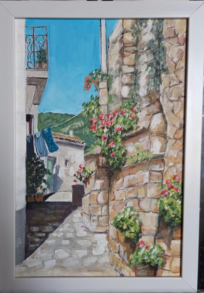 I managed to find 2 white frames for the smallest canvas board paintings of Oliveto and then spent most of today painting edges and adding extra details.