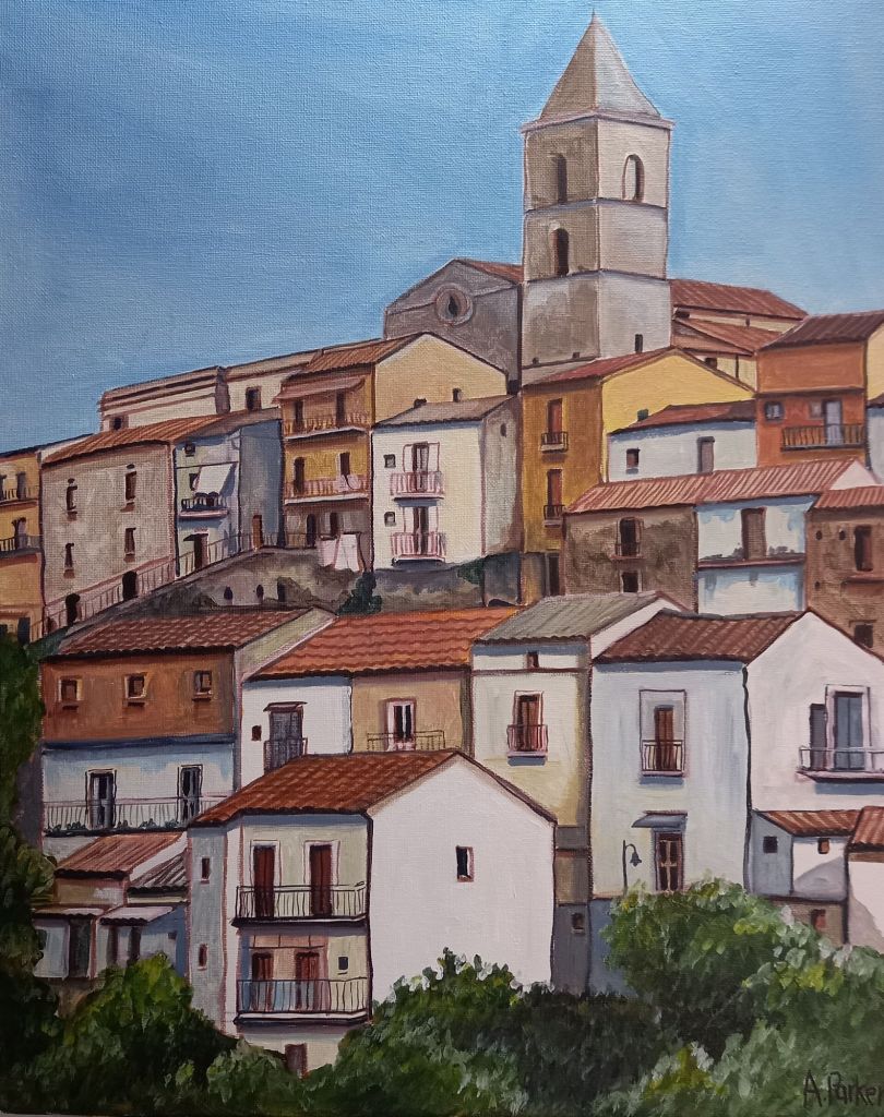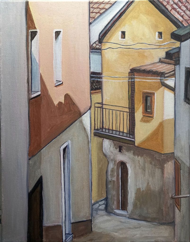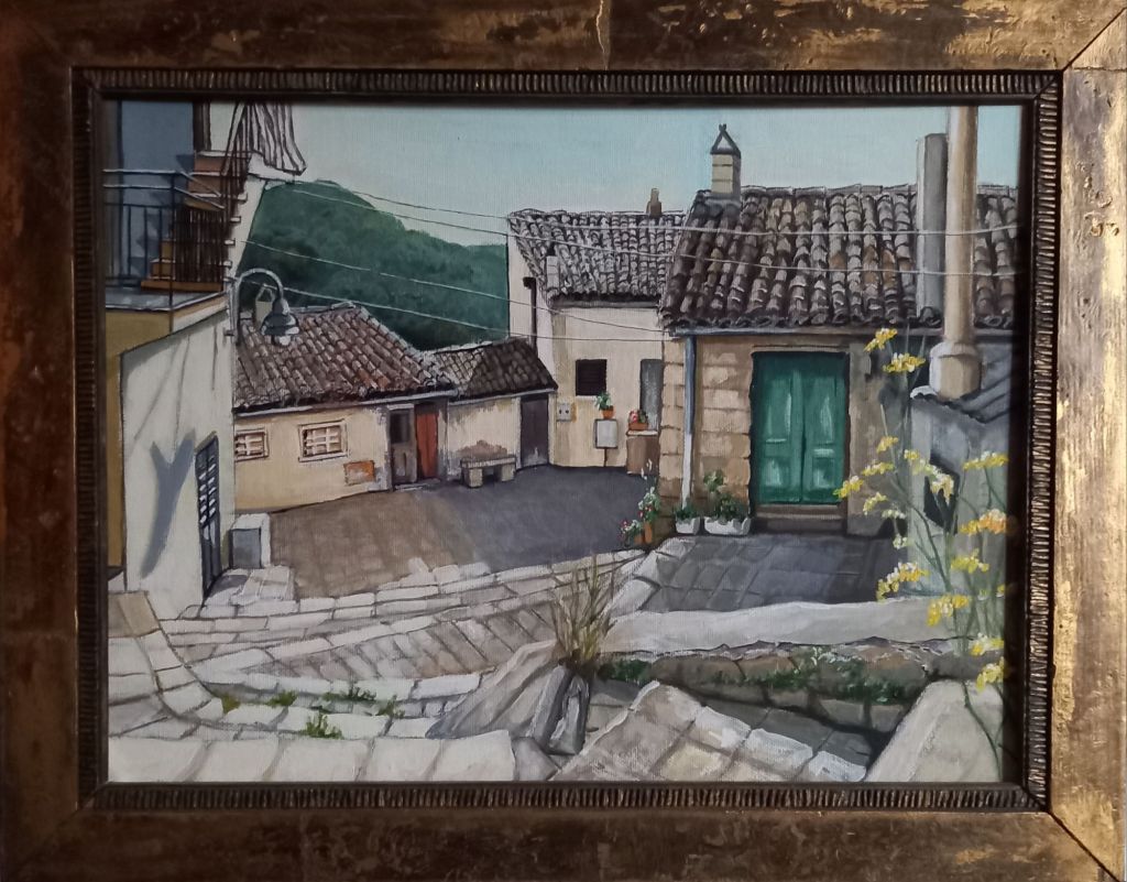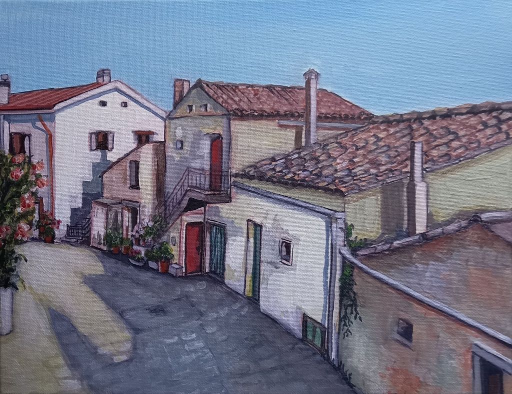 I managed to find 2 white frames for the smallest canvas board paintings of Oliveto and then spent most of today painting edges and adding extra details.