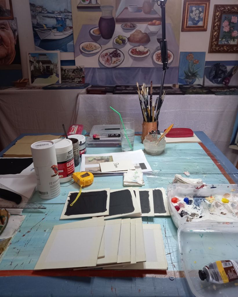 I did that while waiting for the newly black gessoed ones which were sitting on the bins outside in the sunshine, drying.