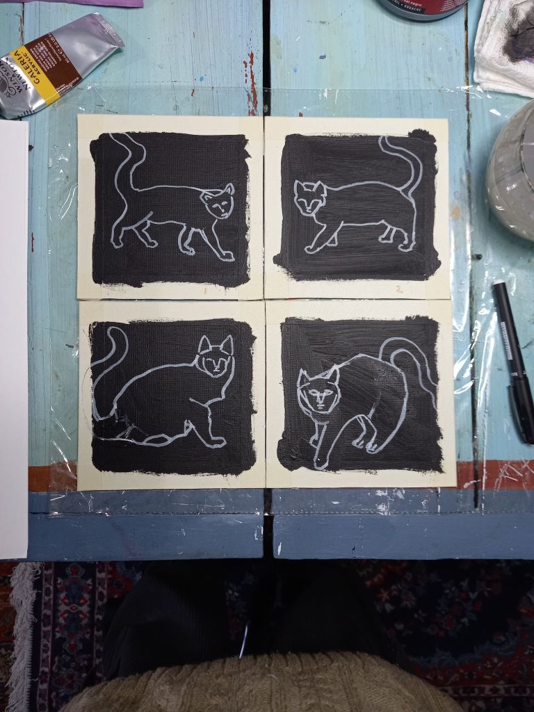 A visitor liked my big canvas which I had just casually underpainted. They will have no idea how much this meant to me as I busily paint hares and now cats to distract me from that canvas which is waiting for me to paint something from my heart ….or something like that.