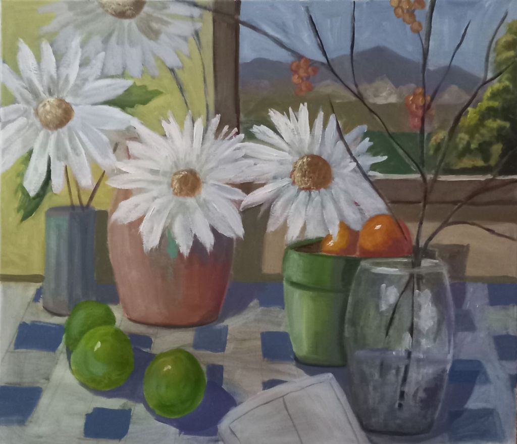 After covering the canvas with a wash of sorts to get started, I think I drew the terracotta pot first and then just filled in the spaces with whatever came to mind.