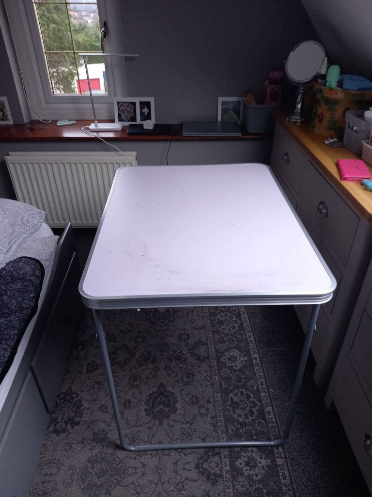 But today I upgraded the folding table which I bought. (It hides behind the mirror when not in use.)