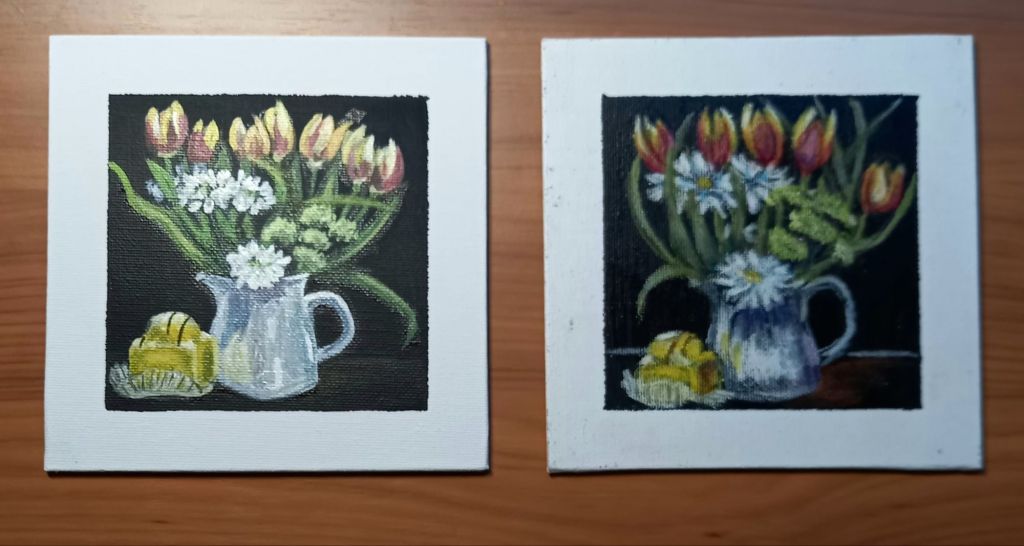 I’ve gessoed 2 pages in different sketchbooks and I painted my flowers and cake again with acrylic paint to compare with the caran d’ache neocolour 2s.