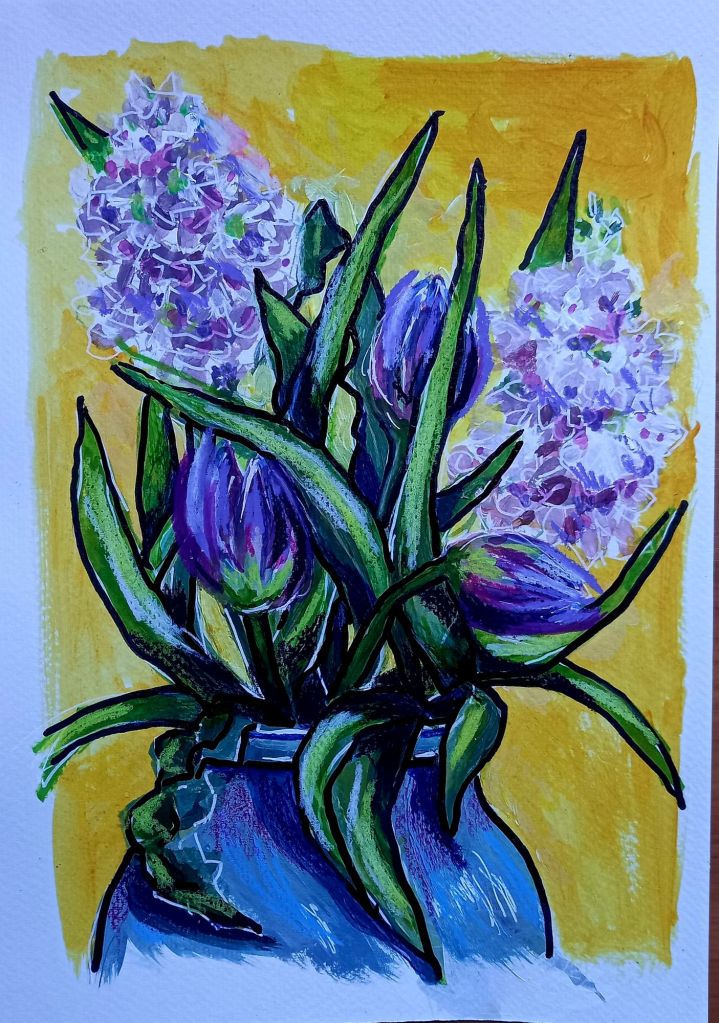 Then I saw my abandoned painting of pinky purple flowers and tulips with leaves which I couldn’t get right. So I had a play around with my new caran D’ache neocolour 2s.