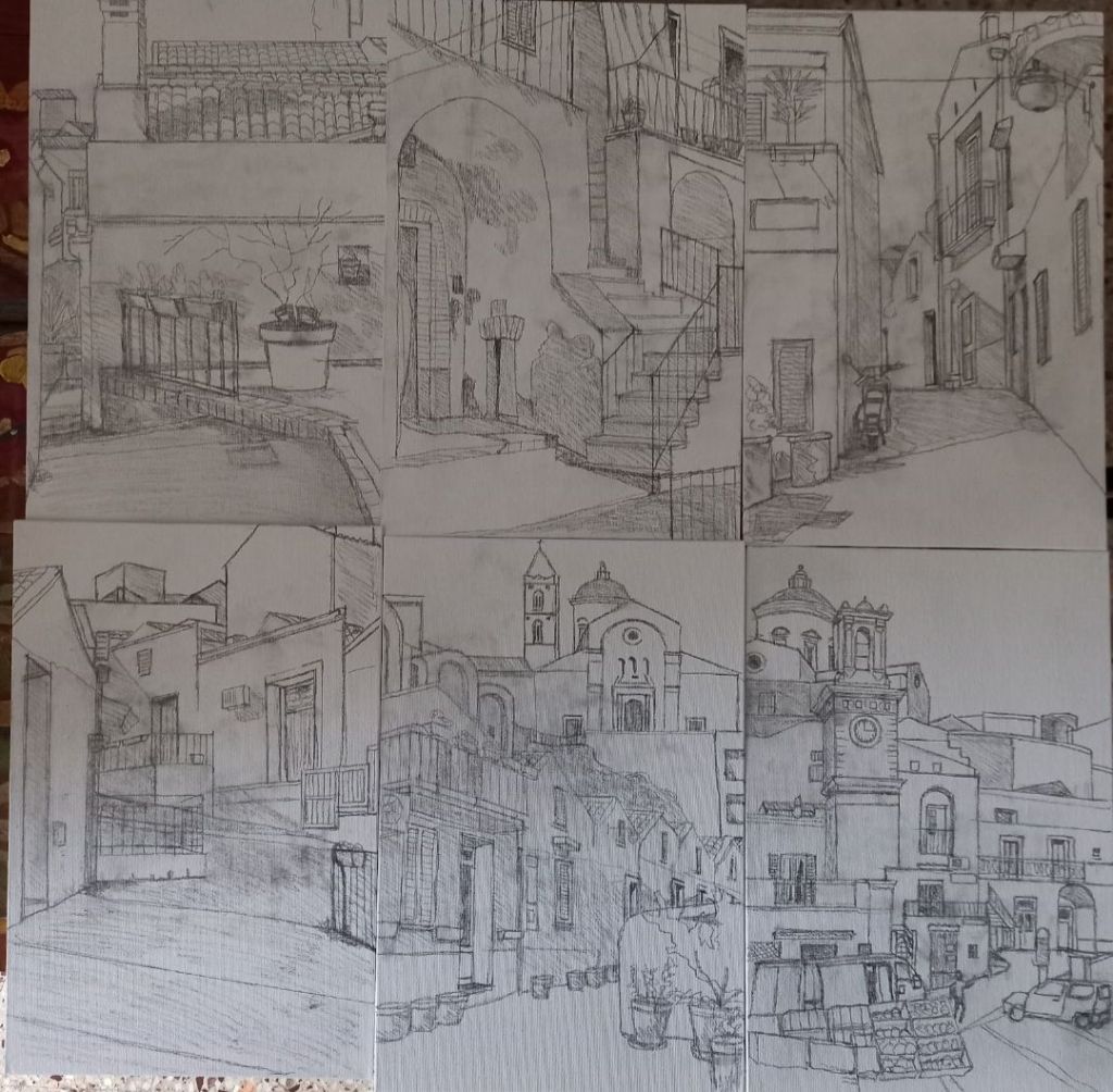 I found a photo of some drawings of local scenes , before I painted them.