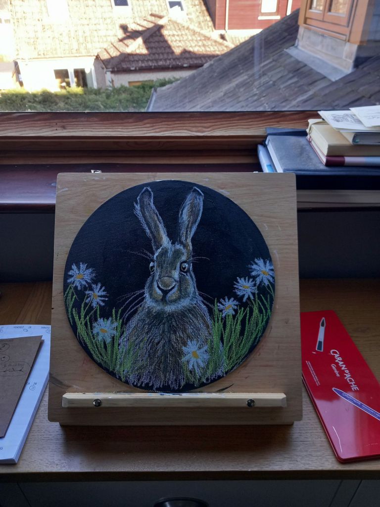 After lunch I added some grass and daisies to the hare painting. Probably not quite finished yet.