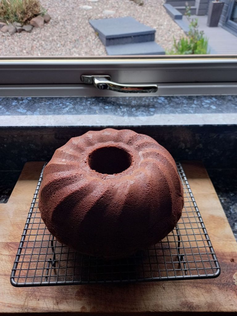 It was a ,mixing the dry ingredients separately and then adding them to eggs, sugar milk, oil and half a large bar of melted Cadburys chocolate which I happened to have, sort of recipe and as I was using a hand whisk , it was hard work.