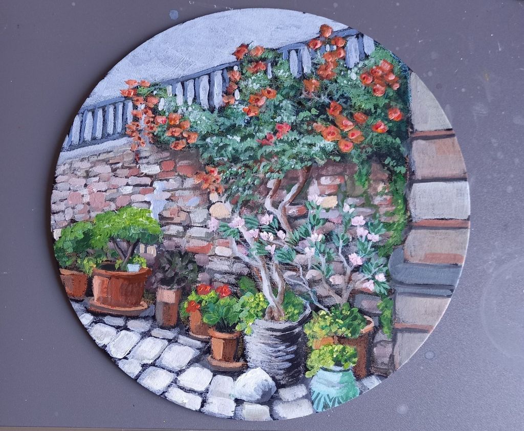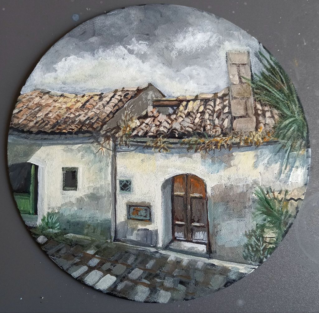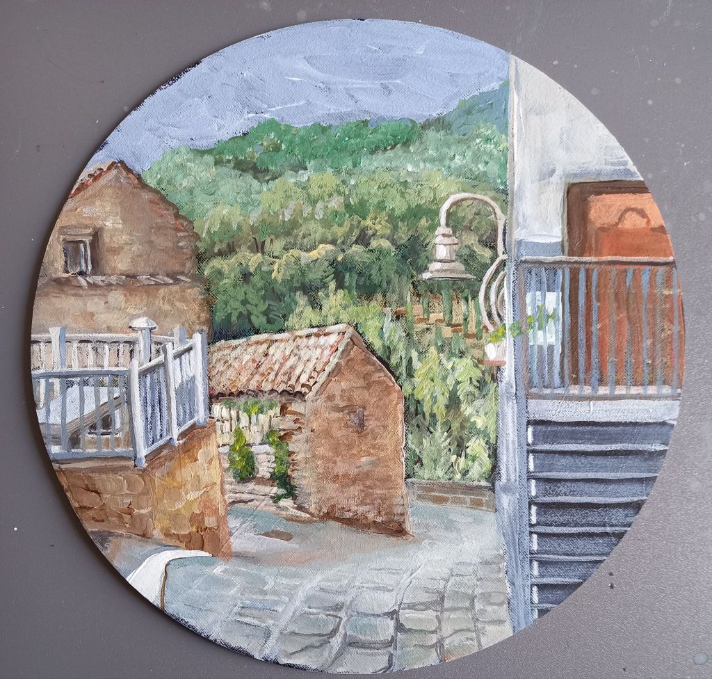 And I finished( more or less) the last 2 round paintings. My plan is to take the last two empty round canvases to paint while I’m in Oliveto . I’ll need something to do….
