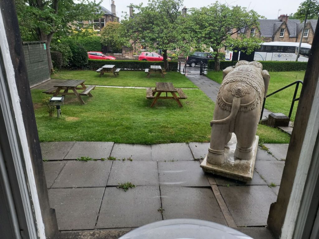 I have a nice view of a marble elephant’s bottom…..and the garden.