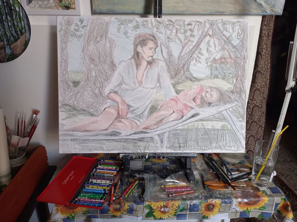 After lunch I carried on painting with acrylics, mostly working on the faces. The photograph has very little detail.