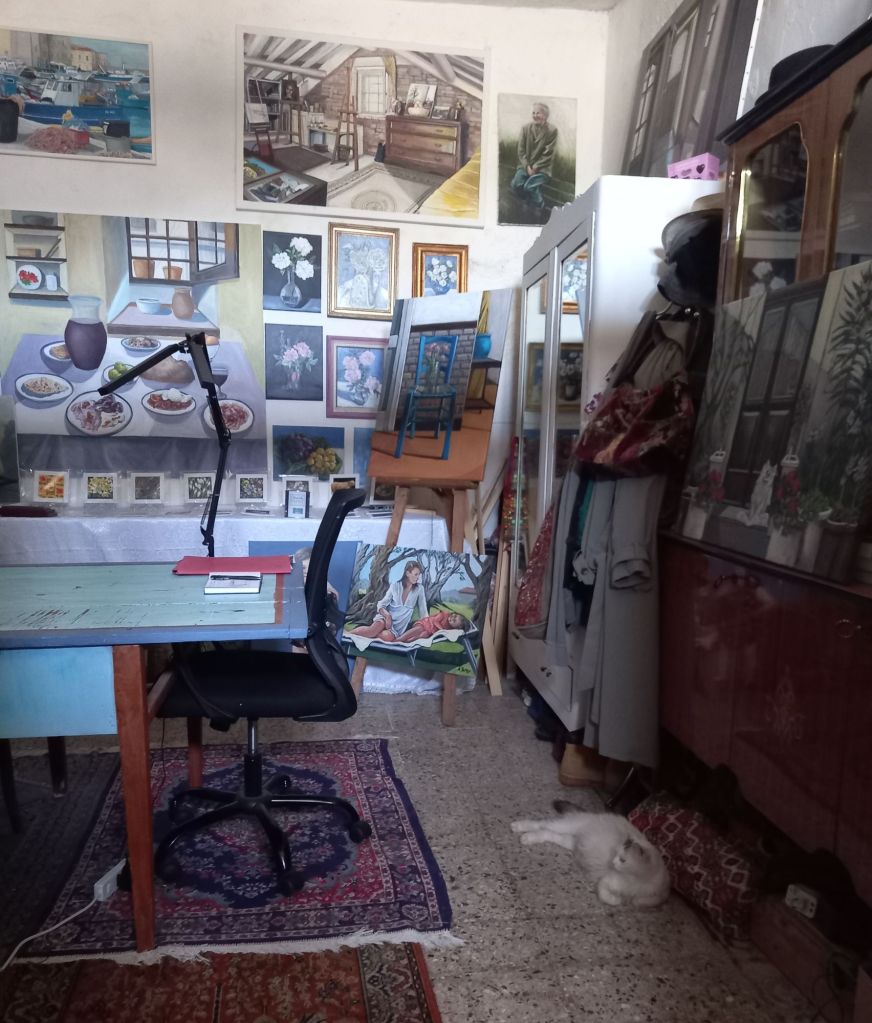 I don’t know if she is just a street cat or has a home somewhere. Most street cats are happy to be fed, but not touched and she has always been very tactile. Usually she comes in , gets stroked, has something to eat and goes off somewhere till the next day. As I’m feeling rather too hot myself I’m fairly sympathetic to her lounging about and keeping cool. But no kittens!!!