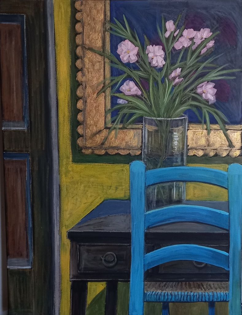 At the same time I worked on the next painting with the blue chair. I decided to make the frame gold. That was fun.