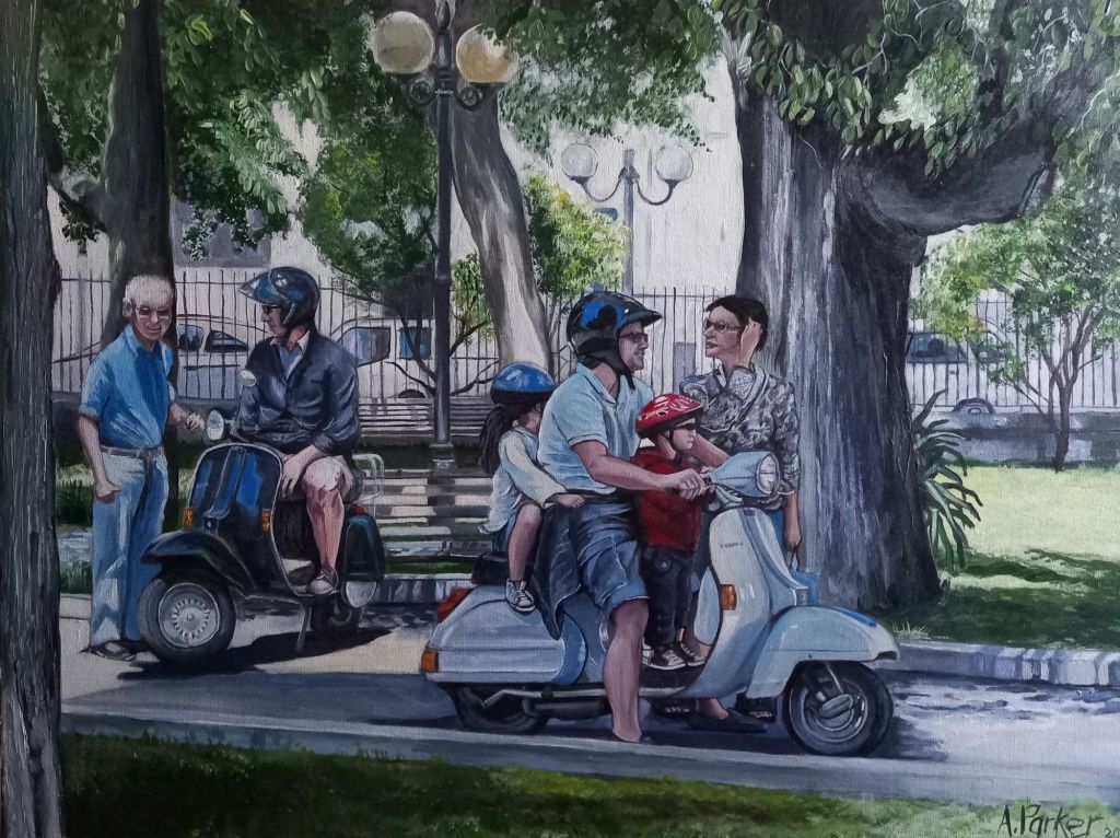 This one is from a photo taken at an antiques market in Ostuni when we were double booked with a scooter rally. It was a lot of work , done in the olden days before I taught my myself to paint faster. (2012)