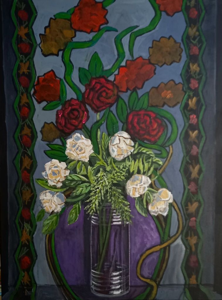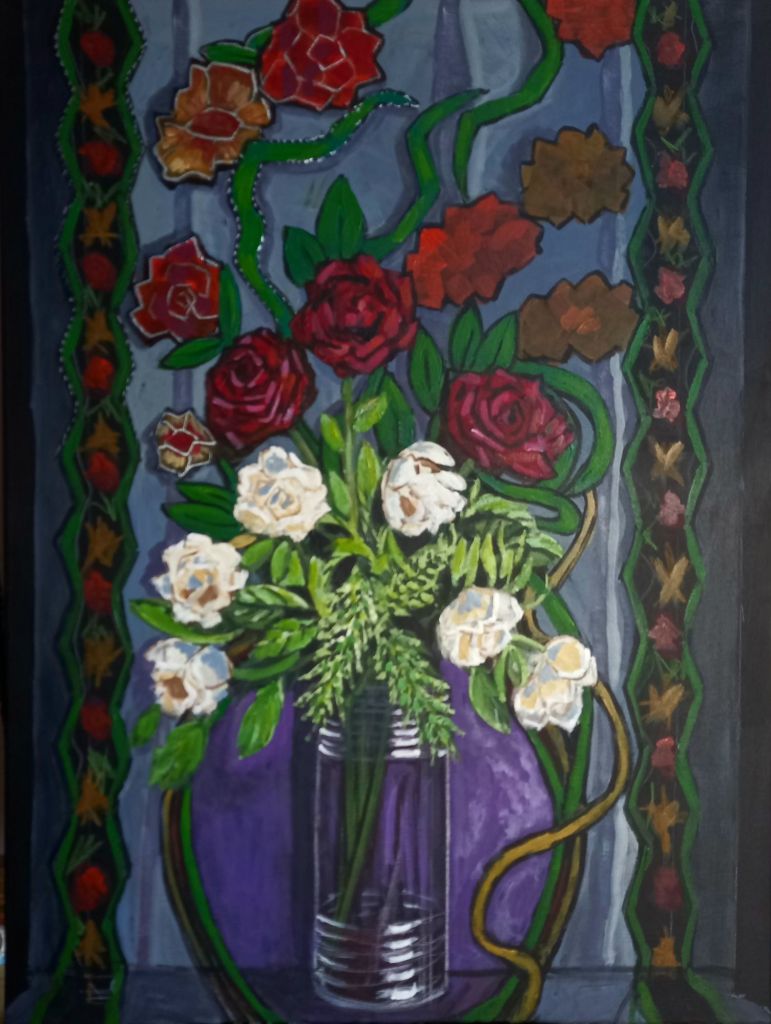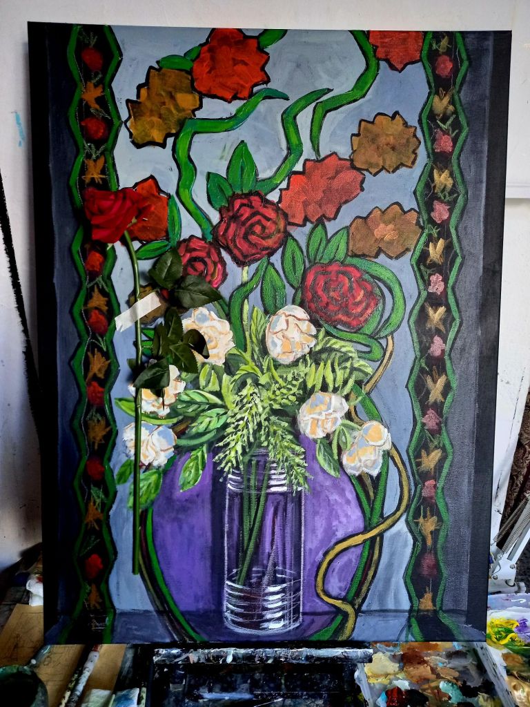 I still have to do something with the white roses. And I don’t think the red roses stand out enough. I’m painting this from life.
