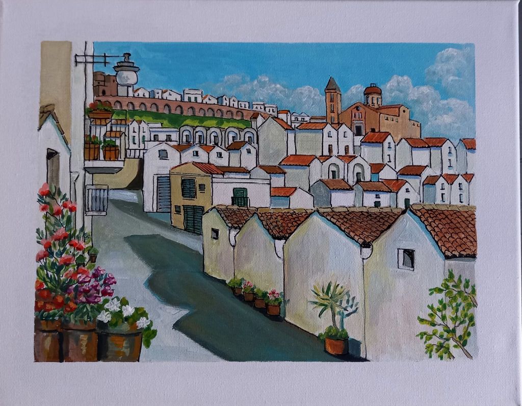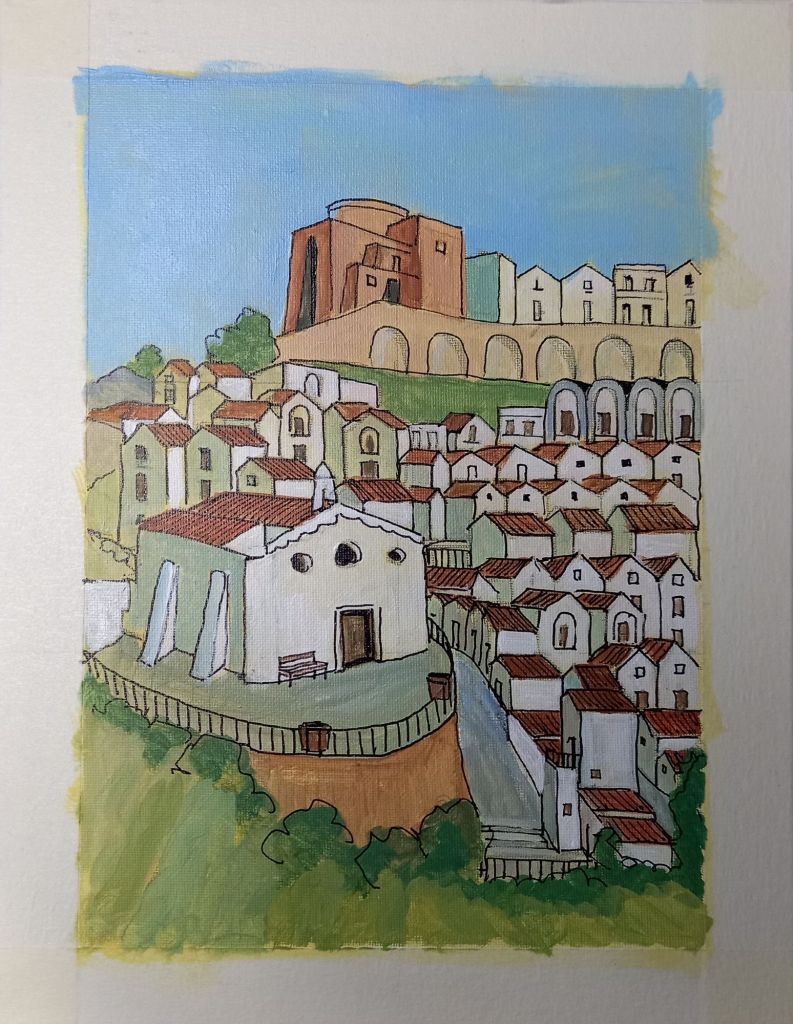After painting flowers and scarves it’s a bit strange to go back to painting fiddly little houses. I’m using my own paintings as reference and not actual photos. I’ve never learned how to paint an impression of lots of houses so that’s why it’s so fiddly.