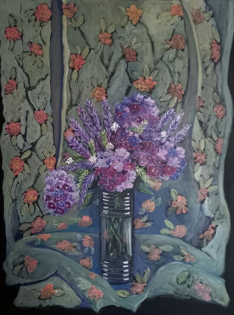 I did some more work on the latest scarf and flowers painting. It still needs more work. I was awake at 3am looking to see if I had acrylic paint pens I could use on it.
