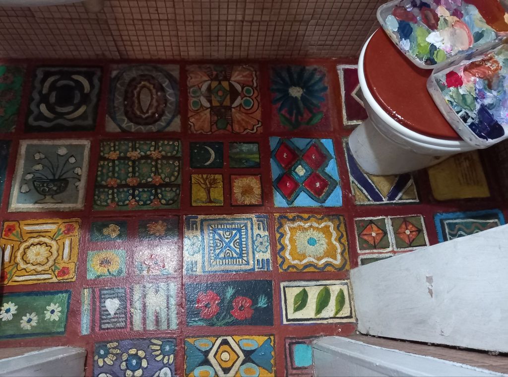 It was easy to fix. I cheered up some of the colours in the patterns as well as repainting the terracotta colour between each tile. I used the acrylic paints which were left in my palette from the last painting.