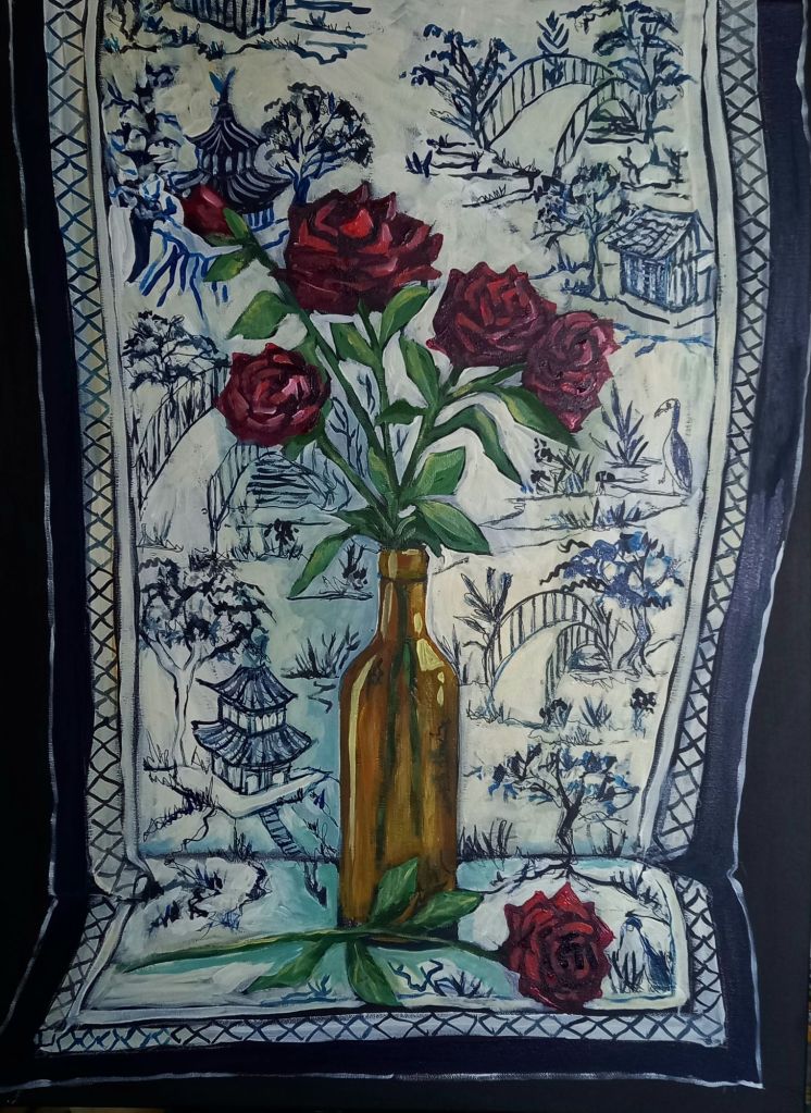 This afternoon I worked some more on my final flower and scarf painting. It’s nearly finished I think.