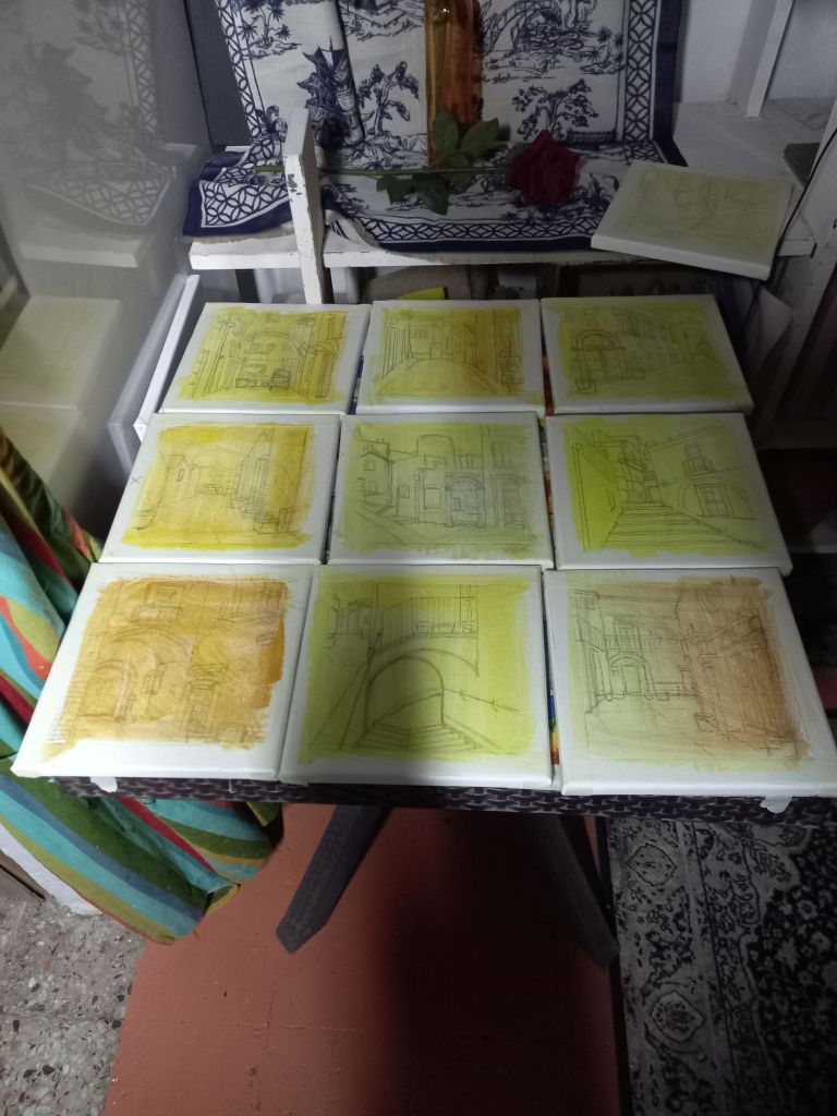Then I prepared 10 small canvases and drew ( roughly) 10 scenes. Now they are ready to draw with a pen before painting.