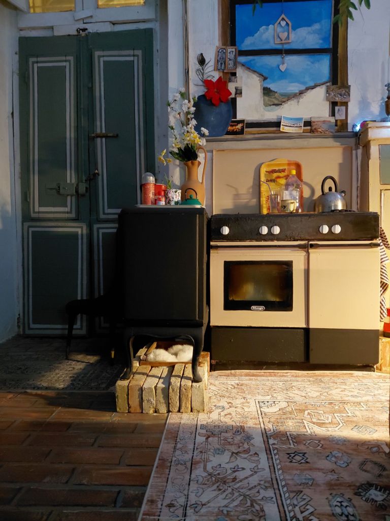 Fluffy is asleep in ” her bed” under the new kitchen unit.