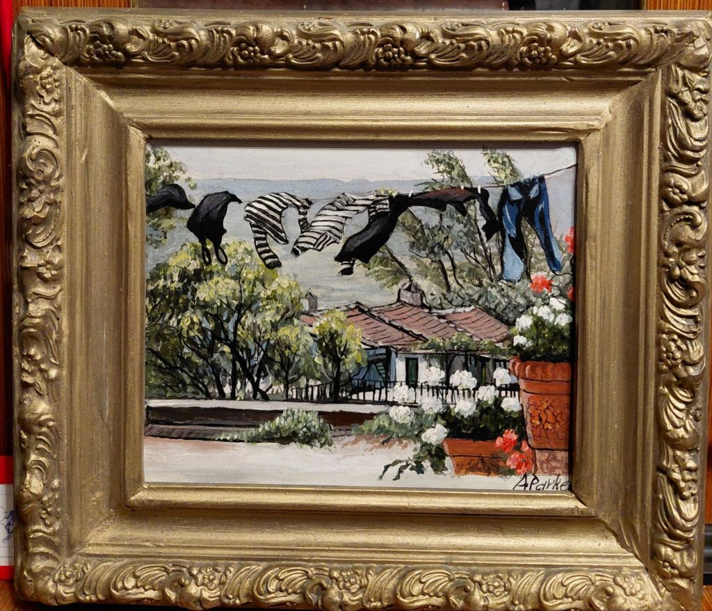 I fixed an old painting of clothes blowing in the wind at the end of my street. It didn’t need much work, just tidied up the sky and painted the back of the painting black as after years of hanging about in my gallery it was a bit grubby. After I varnished it I liked it so much that I found an old gold frame for it.