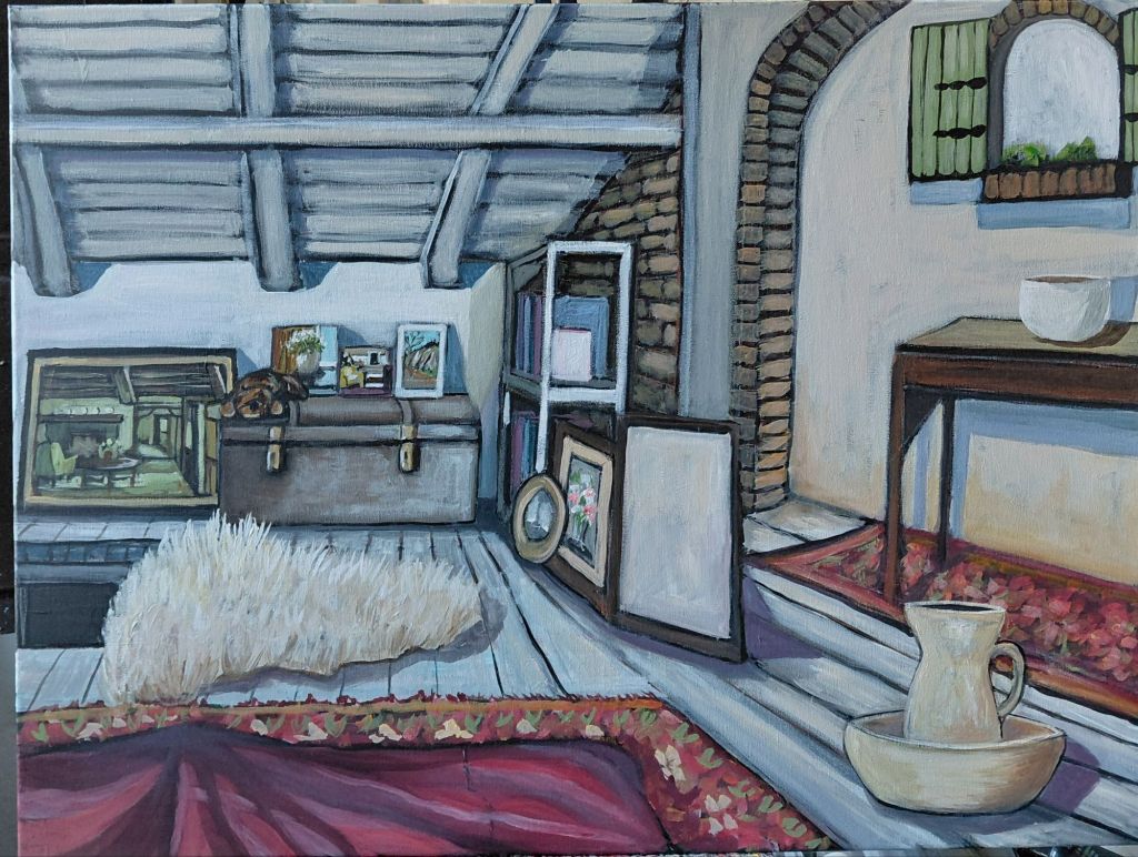 Having been inspired I got to work on the ” view from my bed”. I hardly looked at the photo as it was time to let the painting lead. It’s like I sort of know what needs done to make the painting work. ( Which is a nice feeling.) It’s not finished yet, but it might be okay after all…. yesterday I wasn’t so sure.
