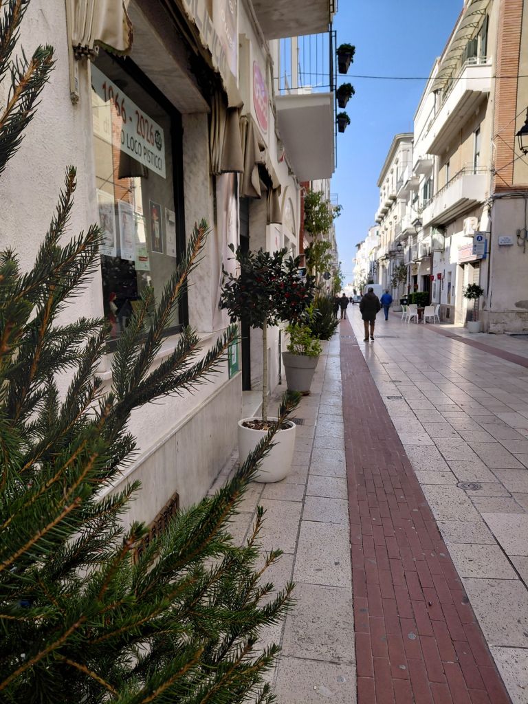 Passed by the Madonna I painted last week. The main street has now got lots of plants and Christmas trees……and what looks like a holly bush.Outside the fruit and veg shop.There are trees and plants all the way down the street.