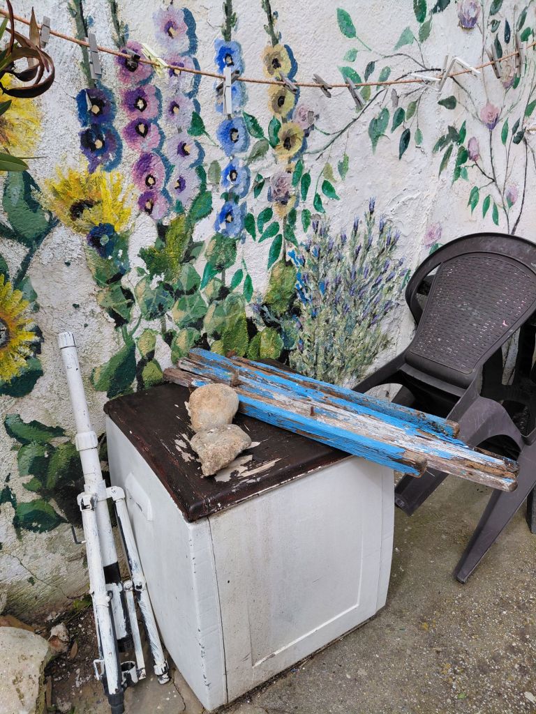 I also collected the straightest bits of broken chair and brought them inside.
